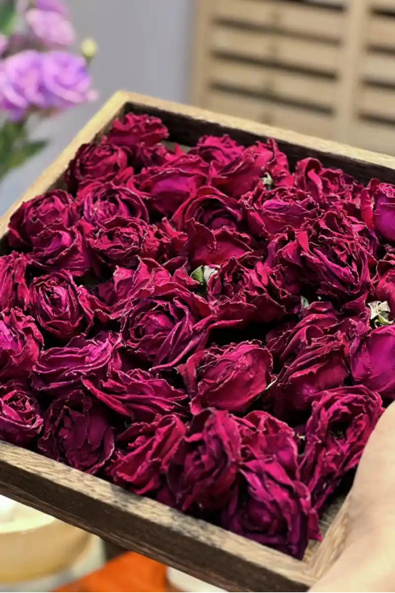 云南高原种植的墨红玫瑰,因昼夜温差大(达15℃)和紫外线强,花青素含量为普通玫瑰3倍。仅取春季(4-6月)“头水花”,此时花苞开放度30%-35%,精油与营养物达峰值。采摘时间只能在每天早晨的8点前,这时候采摘的鲜花保存更完整,避免日照蒸发露水与香气分子。人工分拣剔除开放度>35%或带虫咬、霉斑的花朵,12公斤鲜花仅出产1公斤成品。冻干墨红玫瑰富含花青素、维生素C等k氧物质。冻干技术(FD技术):真空冷冻干燥。结合高原生态种植与航天食品工艺的精密加工方法。